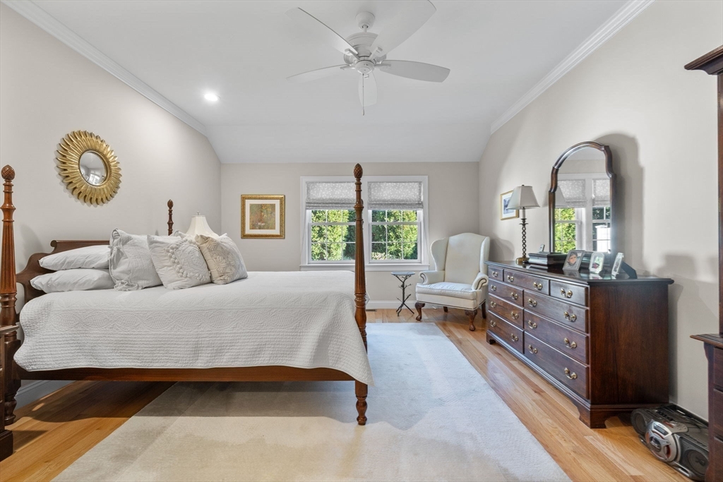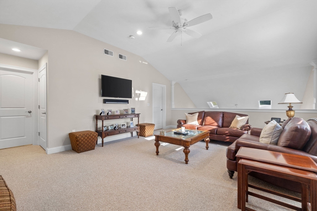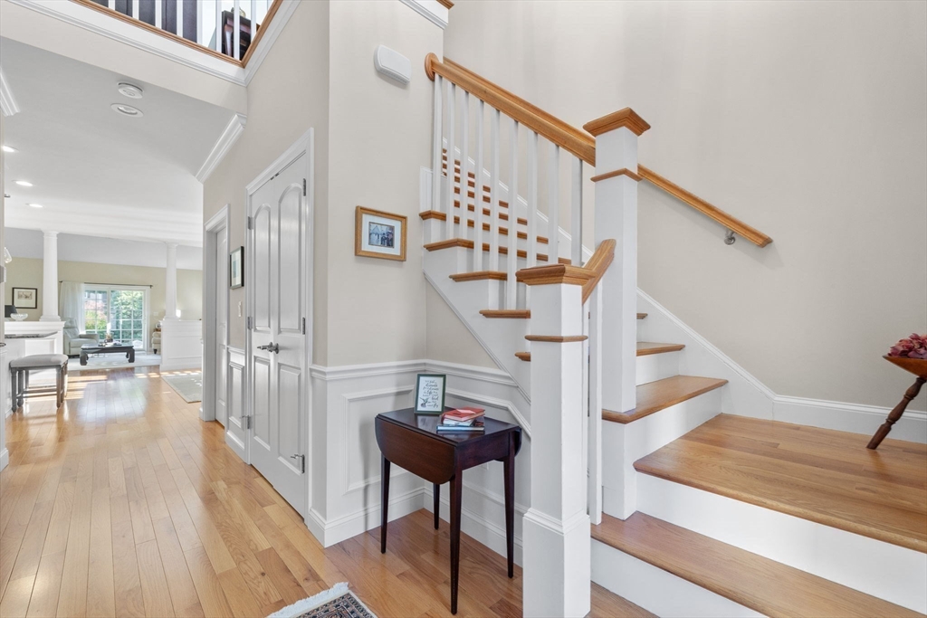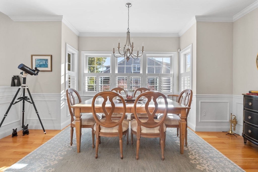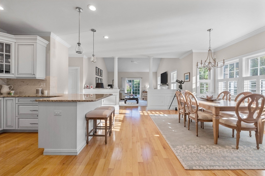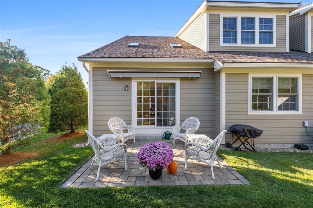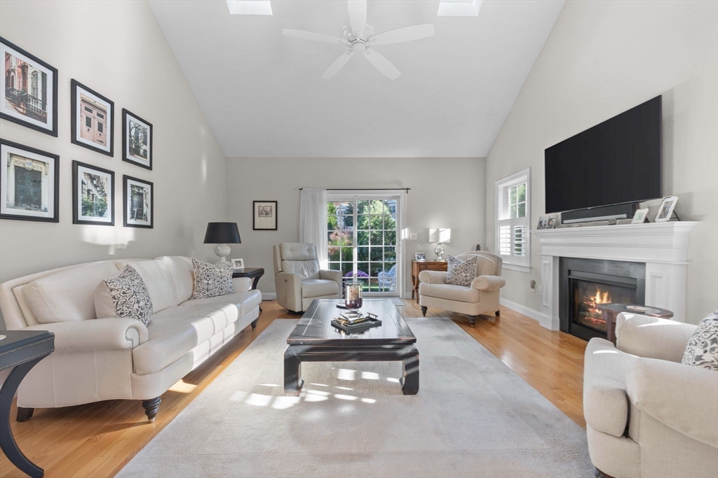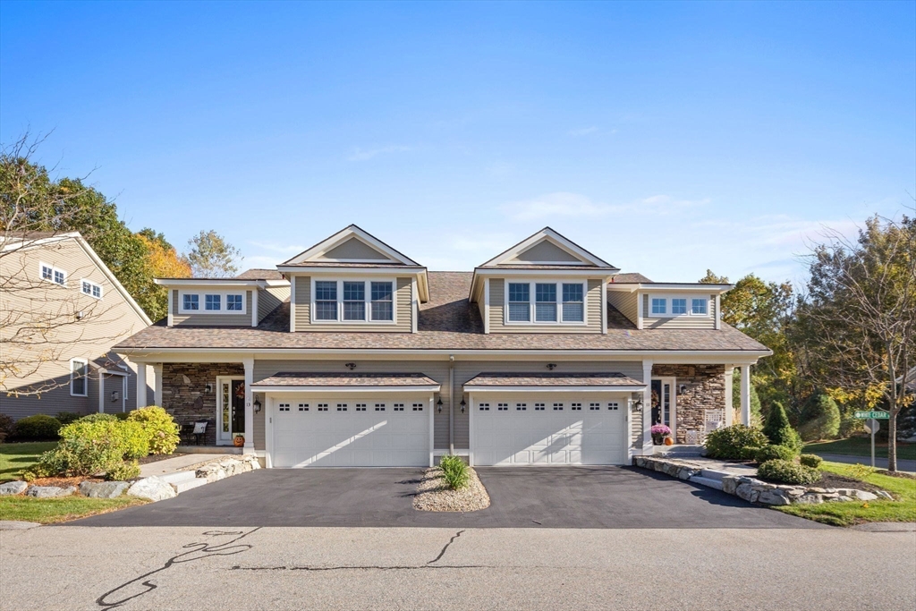 Welcome to North Meadow Village, a 55+ community offering luxurious first-floor living. Step into this beautifully maintained home with perfectly kept hardwood floors, wainscoting, and crown molding throughout, complemented by high ceilings and bright, airy rooms. The heart of the home is the spacious kitchen, ideal for entertaining, featuring light cabinetry, stunning granite countertops, and a generous center island, all perfectly situated in the open-concept layout that flows seamlessly into the dining and family areas. The family room is a cozy retreat with a gas fireplace, Anderson windows, and skylights that pour in natural light. Unwind on the private patio, sheltered by a shade awning, and enjoy the serene surroundings. The primary bedroom, full bath, and laundry are conveniently located on the first floor, providing effortless living. Upstairs, the cozy loft area offers a charming spot to relax, overlooking the family room, while the two spacious bedrooms on the second floor.